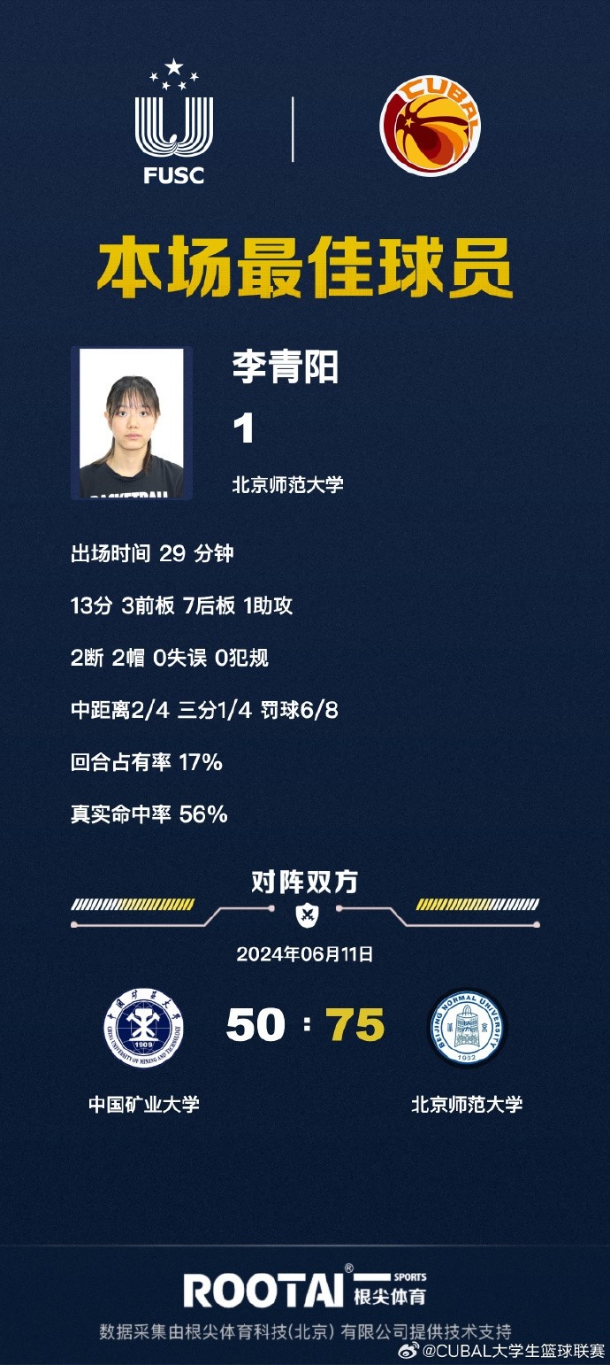 第四节,北京师大进攻回暖,内外开花打出11-2的攻击波再度将分差拉开到20分以上,中国矿大连续打铁失误,北京师大持续发力将优势扩大到30分以上,最终,北京师大75-50大胜中国矿大。
