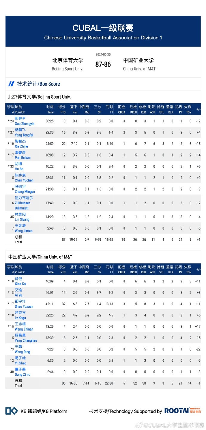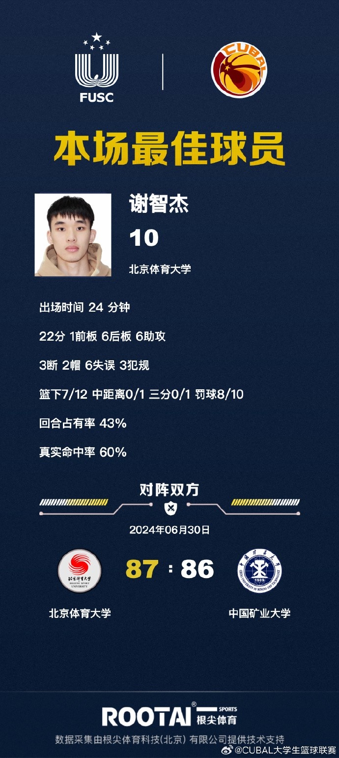 北体大:谢智杰22分7篮板6助攻3抢断2盖帽、杨腾飞16分5篮板、陈宇宸11分2助攻、潘睿彦12分6篮板、林思阳13分3盖帽、胡博8分2篮板