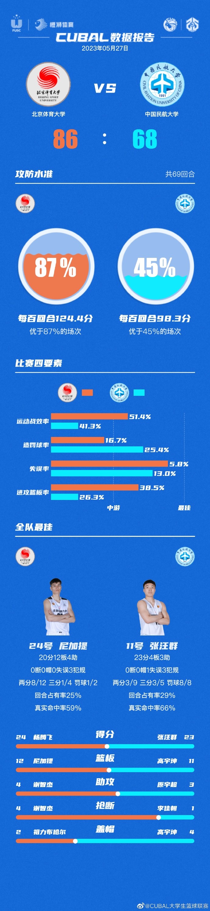 北体大:杨腾飞24分6篮板,尼加提20分12篮板3助攻,谢智杰12分7篮板4助攻5抢断,潘睿彦9分2篮板,鲁骜12分3篮板,祖力布哈儿9分6篮板