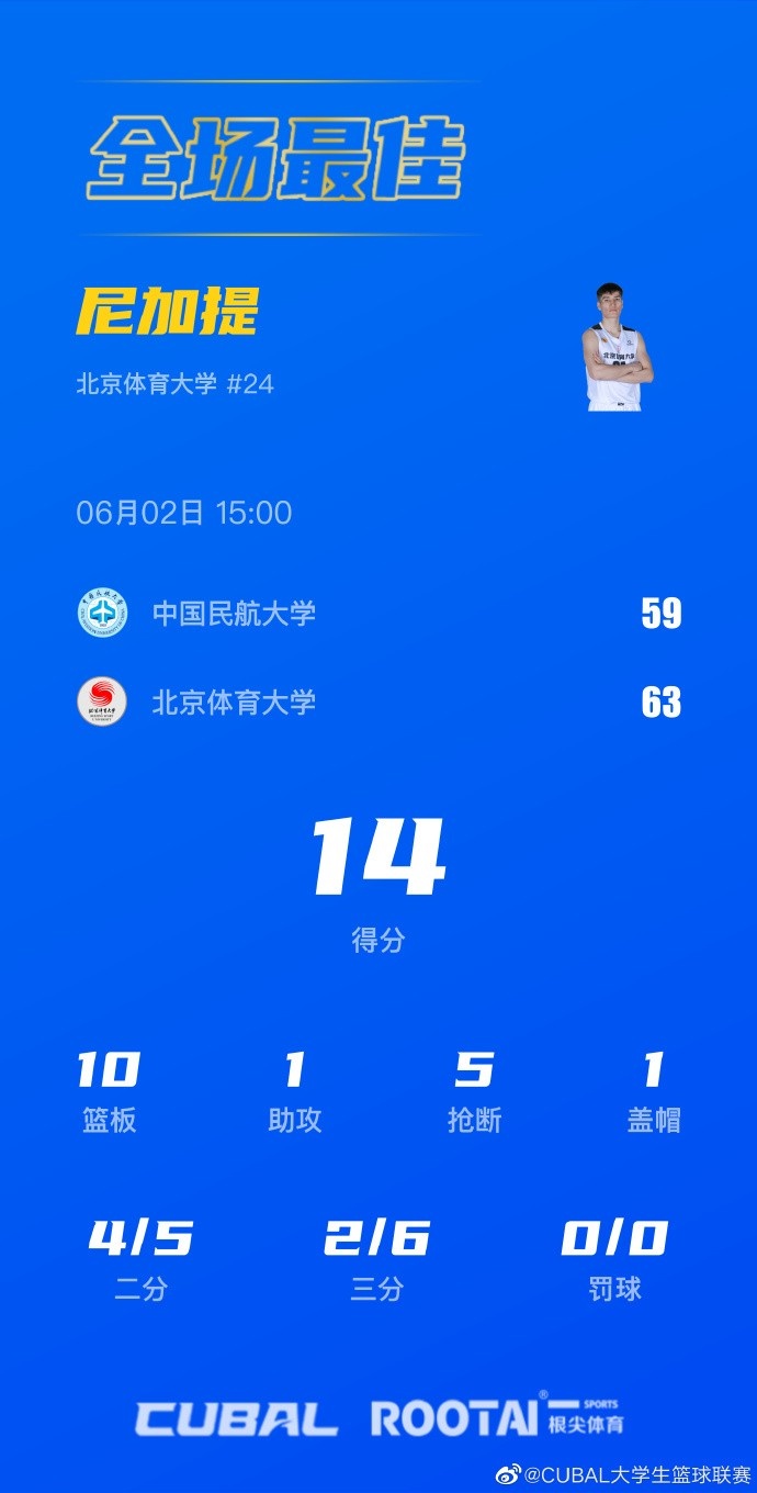 北京体大:尼加提14分10板5断,谢智杰13分9板5助4断,杨腾飞13分8板2帽,杨元升7分5板4助3断,潘睿彦7分7板2助2帽
