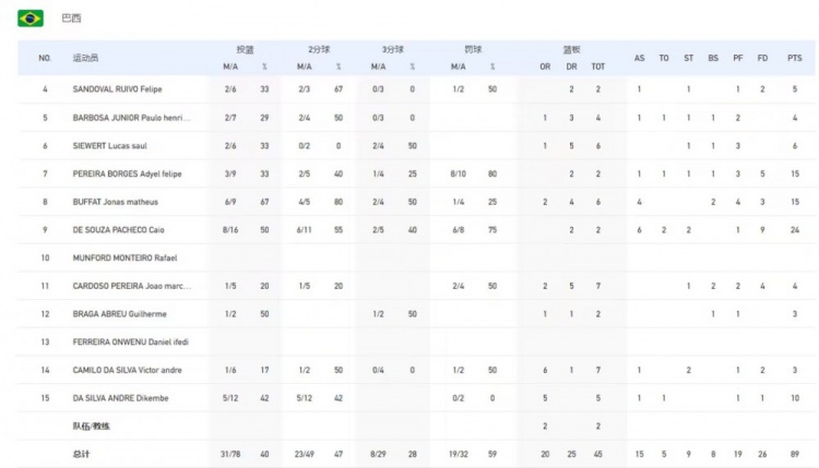 比赛开始,中国队上来比较慢热,反倒是巴西队里突外投打出12-4开局,谢智杰一三分一助攻紧急止血,陈国豪也接连内线打成,黎伊扬接连失误后首节末三分将功补过,中国队17-20落后巴西。次节黎伊扬接连送出助攻,张宁突内线造杀伤帮助中国队反超比分,王岚嵚接连扔进三分砍下8分帮助中国队半场43-40反超巴西3分。下半场,虽然张宁上来就扔进三分,但巴西队迅速一波10-0反超比分,李苑鑫三分止血后洪辛接连拿到两分,三节结束巴西队还是62-59反超中国队。末节巴西队上来连中3记三分将比分拉开至双位数,随后陈国豪带领中国队多次追分未果,最终中国队79-89不敌巴西队,未尝到开门红。