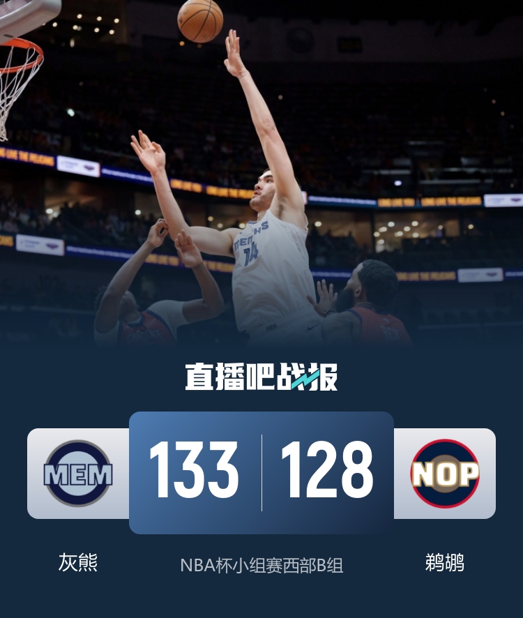 首节对决灰熊上来便送出18-9抢得主动权,然而随后的大半节时间他们状态急剧下滑仅得到7分,鹈鹕反弹轰出一波30-7的攻势一举反超并确立起14分领先;次节鹈鹕牢牢掌控局势,灰熊最后3分钟里一分未得,阿尔瓦拉多成为奇兵末段连中三记三分独得11分并帮助鹈鹕带着15分领先进入下半场。休息归来灰熊反弹轰出17-7的攻势追近比分,鹈鹕虽然限制不住对手但很快通过进攻回暖顶住压力;末节末段一直被动的灰熊终于抓住机会送出13-2的攻势一举反超比分,不过鹈鹕凭借锡安的进球拖入加时。