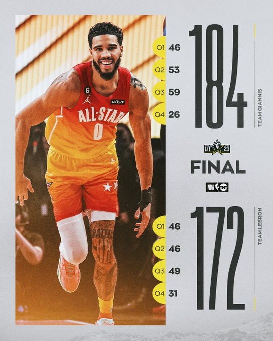 首节字母哥轻松扣篮拿下全场第一分,随后他因为手腕的伤势直接申请犯规下场就此结束自己的正赛之旅。开局对决双方依旧是不设防各种精彩暴扣拉开序幕,两队外线手感不佳,其中利拉德首节7次三分尝试仅命中1球;不过外线手感不佳不影响双方轻松拿分,首节塔图姆拿下13分双方均轰下46分。次节双方延续高效对攻,莫兰特上演360度转身扣篮,詹姆斯也是招牌的暴力砸框,马尔卡宁虽然首次入选但一点不怵甚至想来一次空接大风车暴扣,最后字母哥队以一波10-4的小高潮赢下这一节对决,同时半场总比分上99-92领先詹姆斯队。下半场字母哥外线突然爆发,其中利拉德大秀超远三分一人命中4球,塔图姆更是炸裂飚进7记三分单节砍下27分,这波疯狂进攻结束后字母哥158-141领先字母哥进入第四节,而这也意味着落后的詹姆斯队要在第四节拿到41分才能取胜,末节詹姆斯队虽然推速度并占据上风但难以扭转局面,利拉德最后精准三分杀死比赛。最终,字母哥队轻松击败詹姆斯队拿下比赛胜利,而砍下55分的塔图姆毫无疑问当选全明星MVP。