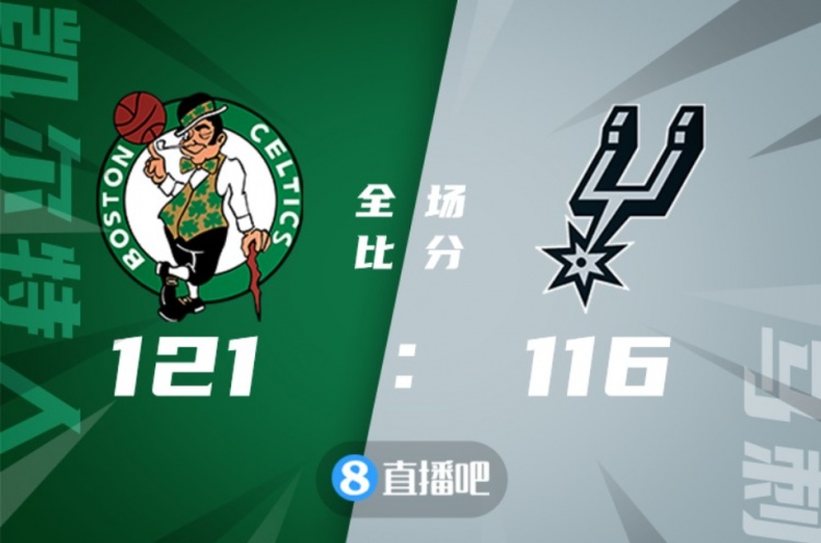 比赛开始,双方开场阶段势均力敌,凯尔特人在双探花的带领下占据主动,马刺全民皆兵与对手周旋,相持中凯尔特人逐渐占据上风,双探花凭借超强的个人能力帮助球队领先11分结束上半场。易边再战,马刺奋力反击,多点开花不断蚕食分差,凯尔特人及时回暖重获两位数领先,马刺没有放弃顽强咬住,关键时刻理查德森三分一度扳平,塔图姆连投带罚拿到3分,布罗格登拿到关键前场篮板杀死比赛。最终,凯尔特人121-116力克马刺,客场过关。