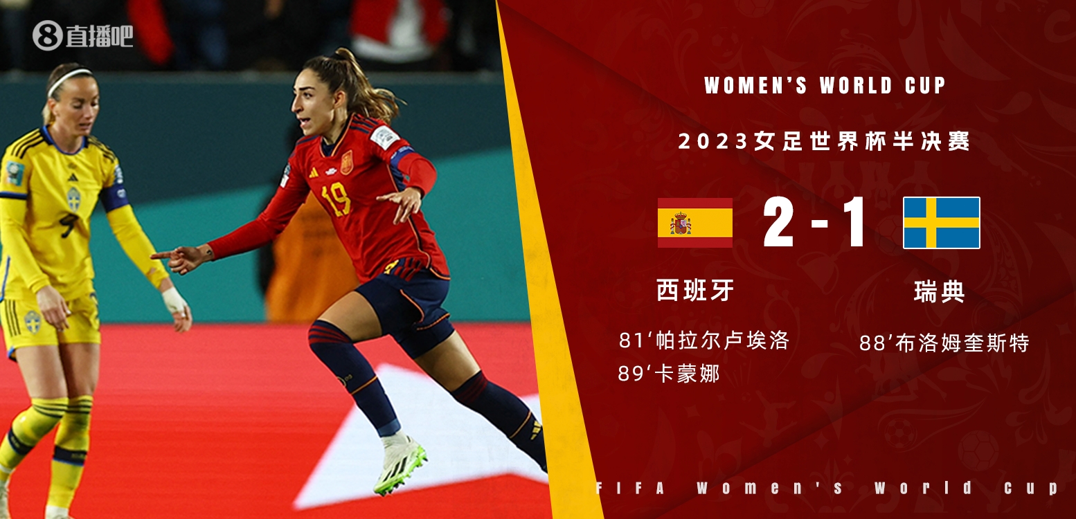 8月15日讯 北京时间8月15日16:00,女足世界杯半决赛西班牙迎战瑞典的比赛,上半场卡蒙娜远射造险,双方互有攻守,半场结束,西班牙女足0-0瑞典女足。下半场雷东多门前失良机,帕拉尔卢埃洛替补出场建功,布洛姆奎斯特扳平,卡蒙娜世界波绝杀,最终西班牙女足2-1瑞典女足首进决赛。