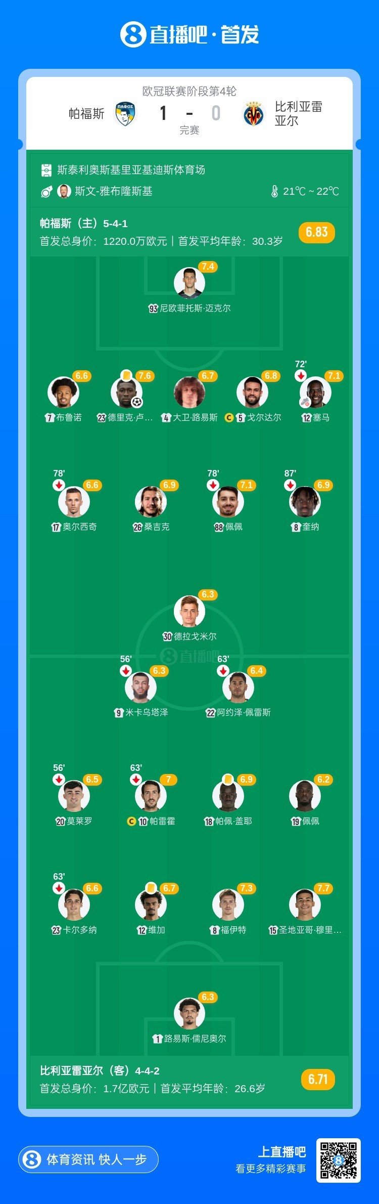 全场比赛结束,帕福斯主场1-0战胜比利亚雷亚尔。