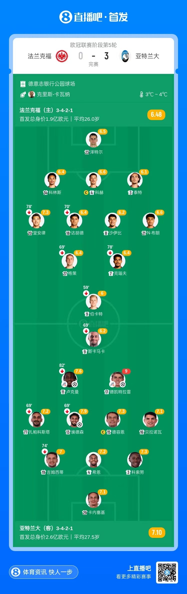11月27日讯 北京时间4:00,欧冠联赛阶段第5轮,法兰克福vs亚特兰大,比赛在德意志银行公园球场打响!上半场,亚特兰大两度中柱。下半场,卢克曼2分钟传射建功,埃德森破门,随后德凯特拉雷进球同样完成传射!最终,亚特兰大3-0击败法兰克福。