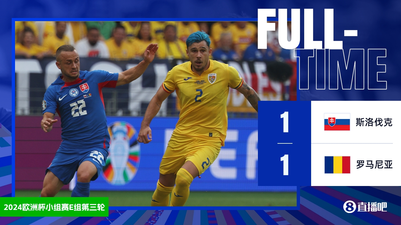 全场比赛结束,斯洛伐克1-1罗马尼亚。