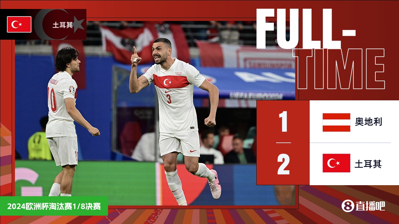 7月3日讯 北京时间3:00,欧洲杯1/8决赛奥地利vs土耳其。上半场,德米拉尔开场57秒乱战中闪击破门!下半场,德米拉尔利用角球再次破门,完成双响!格雷戈里施同样利用角球扳回一城;读秒阶段,古诺克神扑拒绝被绝平!最终,土耳其2-1击败奥地利,晋级欧洲杯8强,1/4决赛将迎战荷兰!