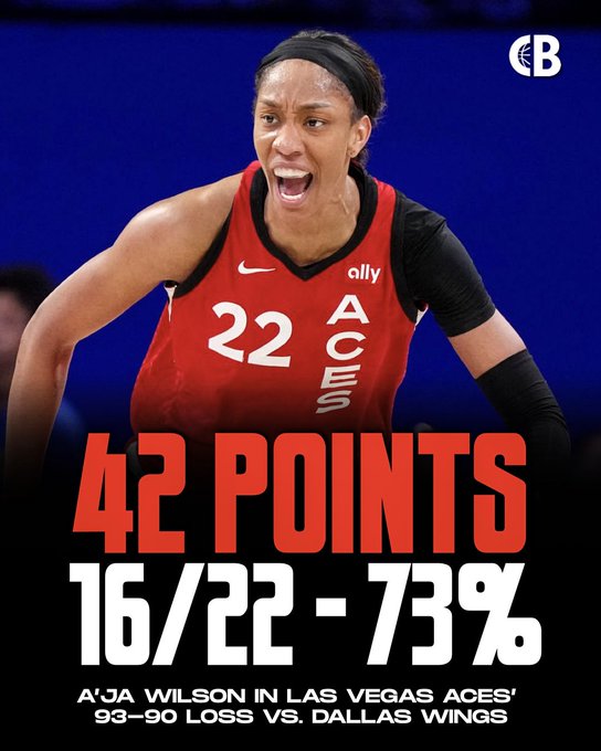 其中王牌主将阿贾-威尔逊出战37分钟,投篮22中16,三分2中0,罚球13中10,疯狂砍下42分6篮板2助攻1抢断3盖帽。