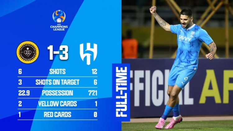 第90+7分钟,阿尔多萨里直塞,哈姆丹插上单刀破门!塞帕罕1-3利雅得新月↓