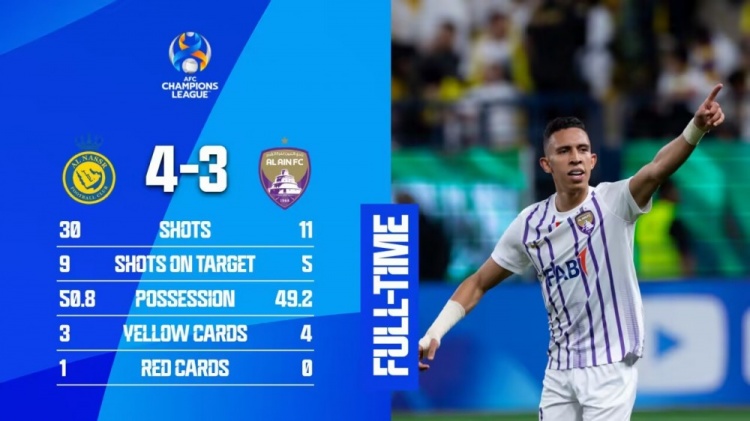 3月12日讯 北京时间3月12日凌晨3点整,2023-24赛季亚冠1/4决赛次回合展开角逐,利雅得胜利坐镇主场迎战阿尔艾因,首回合胜利0-1落后对手。上半场拉希米双响,加里卜扳回一城,C罗禁区倒地未判点,下半场奥塔维奥造乌龙,C罗超近补射打偏,特莱斯追平总分,90分钟双方总比分3-3战平。加时赛叶海亚飞踹染红,门将纳贾尔失误致丢球,C罗造点&点射再次扳平总比分。点球大战布罗佐维奇、特莱斯和奥塔维奥失点,C罗打进。最终利雅得胜利总比分5-7不敌阿尔艾因,胜利止步亚冠八强,半决赛艾因将对阵新月与联合之间的胜者