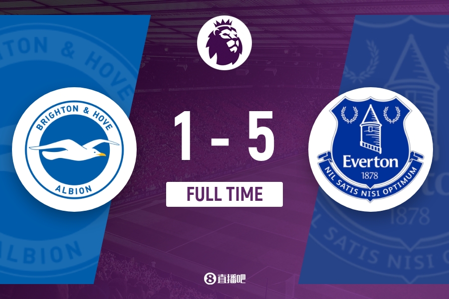 全场比赛结束,埃弗顿5-1击败布莱顿。
