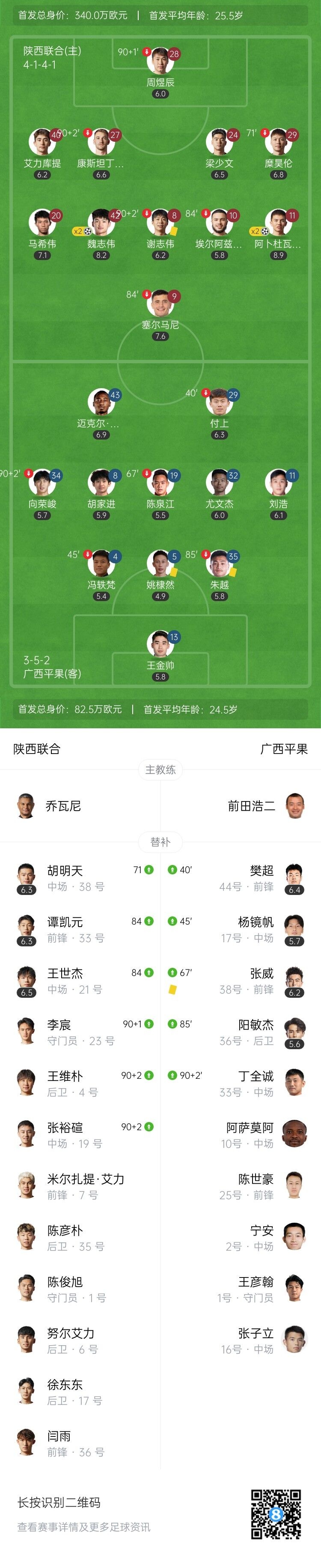 伤停补时7分钟。全场比赛结束,陕西联合5-1广西平果。