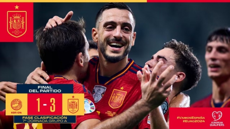 11月17日讯 北京时间11月17日凌晨1时,欧预赛A组第9轮,西班牙客场对阵塞浦路斯。上半场,奥亚萨瓦尔传射,亚马尔、何塞卢破门。西班牙半场3-0领先塞浦路斯。下半场,皮莱亚斯扳回一城。最终西班牙客场3-1击败塞浦路斯,取得5连胜,继续排名小组榜首。