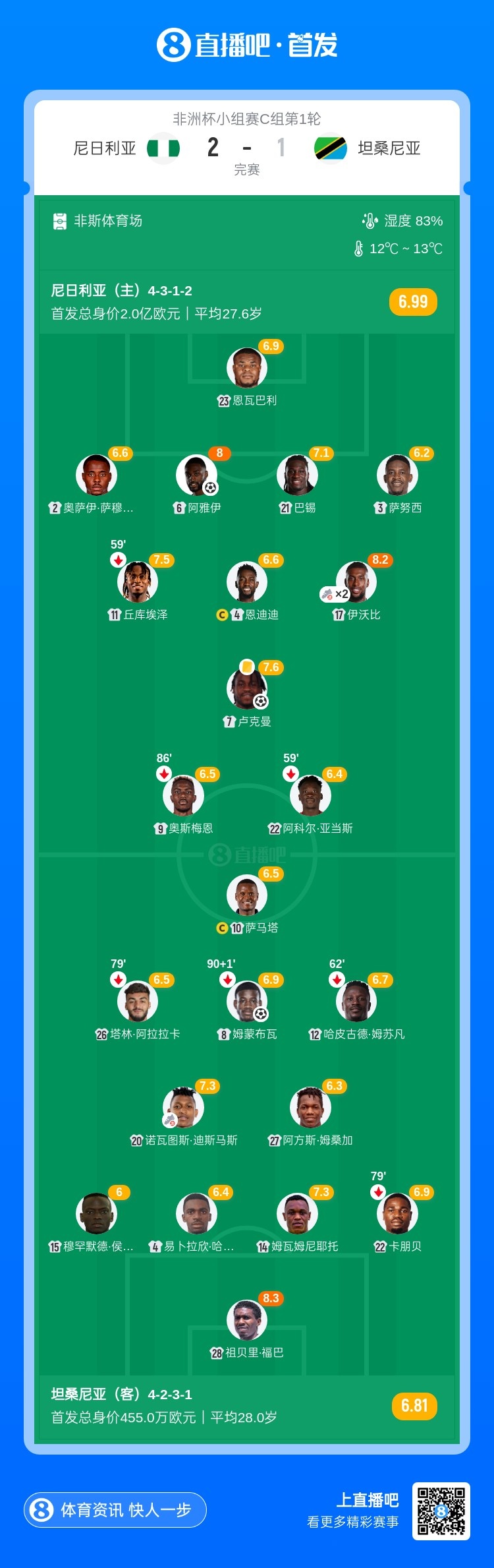 12月24日讯 北京时间1:30,非洲杯小组赛C组第1轮尼日利亚vs坦桑尼亚。上半场,阿科尔·亚当斯中横梁;奥斯梅恩小角度空门被门线解围;伊沃比助攻,阿雅伊头球打破僵局!下半场,姆蒙布瓦帮助坦桑尼亚扳平比分,但2分钟后伊沃比再次助攻,卢克曼远射破门!最终,尼日利亚2-1击败坦桑尼亚,取得本届非洲杯开门红。