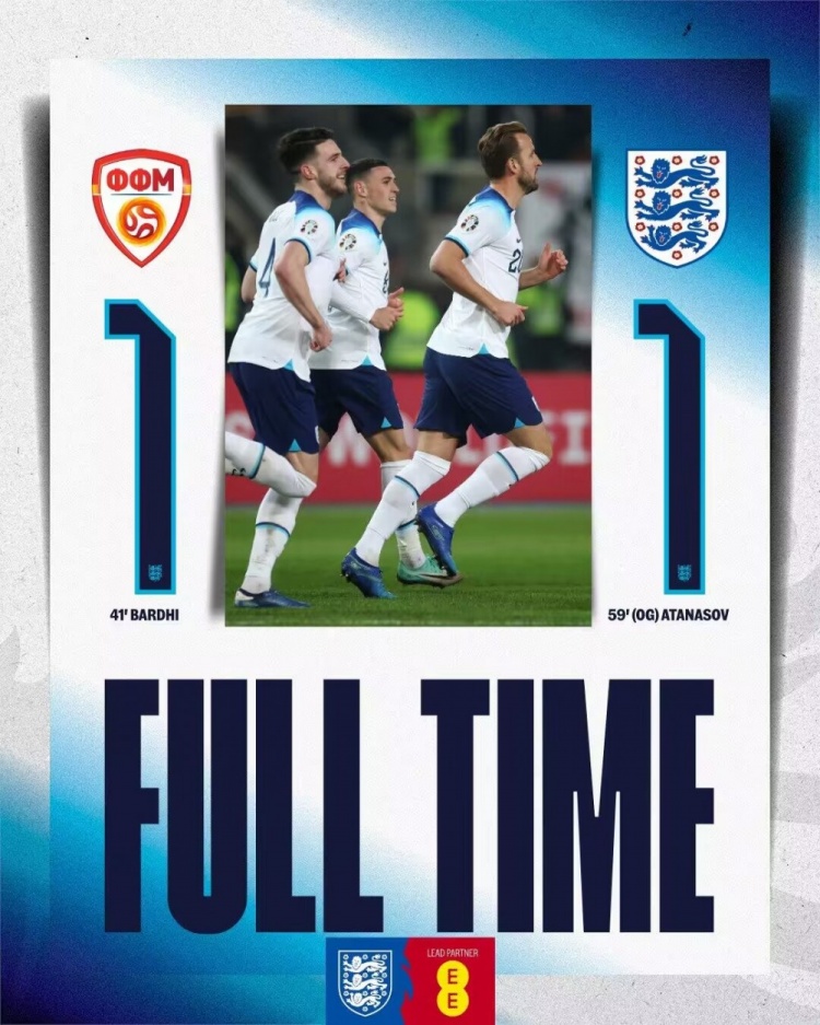 全场比赛结束,英格兰1-1北马其顿。