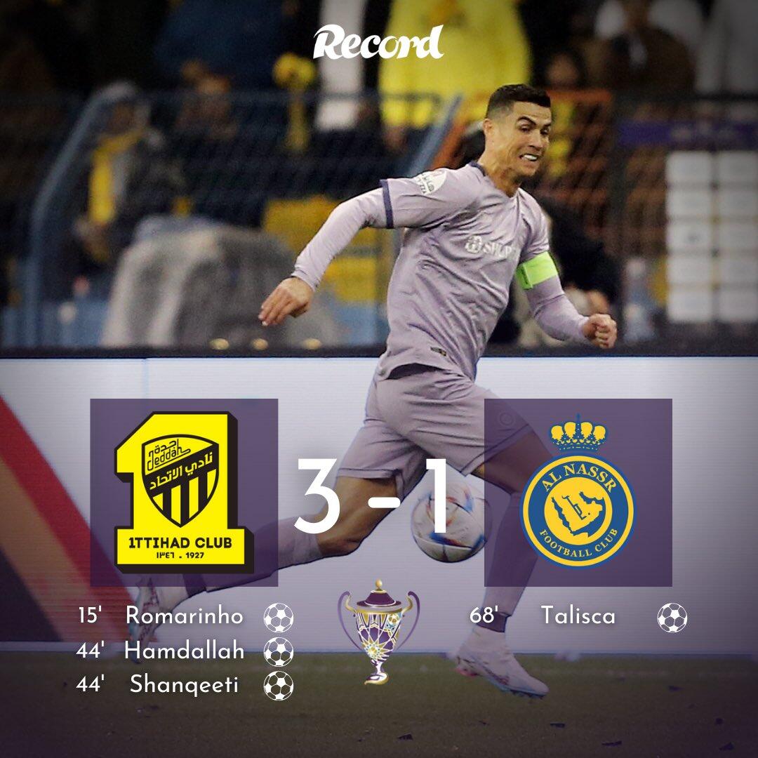 1月27日讯北京时间1月27日凌晨2:00,沙超杯半决赛,利雅得胜利vs吉达联合。上半场,罗马里尼奥铲射为吉达联合取得领先,尾声阶段,哈姆达拉头球破门扩大比分;下半场,塔利斯卡抽射破门扳回一球,补时阶段,比西破门锁定胜局。全场比赛结束,利雅得胜利1-3吉达联合无缘决赛!