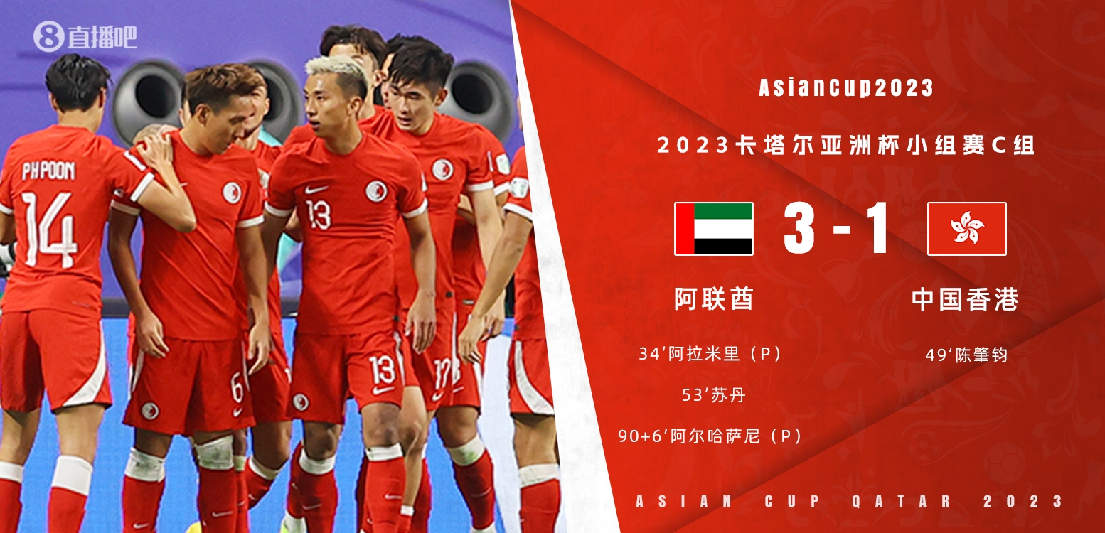 1月15日讯 北京时间1月14日22:30,亚洲杯C组小组赛第一轮,阿联酋vs中国香港。上半场,周缘德手球送点,阿拉米里主罚命中,德利马远射击中横梁;下半场,陈肇钧打进中国香港队56年来的首粒亚洲杯进球,苏丹破门助阿联酋再度领先,阿尔哈萨尼补时点球再下一城。最终,中国香港1-3阿联酋队,中国香港队第二轮对阵伊朗,阿联酋对阵巴勒斯坦。
