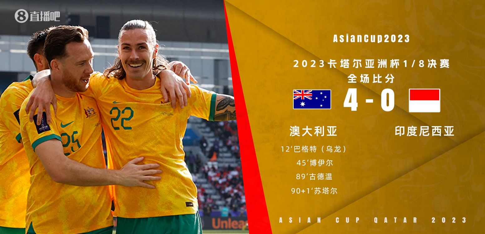 1月28日讯 北京时间1月28日19:30,亚洲杯1/8决赛,澳大利亚对阵印度尼西亚。上半场比赛,杰克逊-欧文造乌龙,博伊尔飞身头球破门;下半场比赛,古德温替补登场补射破门,苏塔尔最后时刻头球锁定胜局。全场比赛结束,澳大利亚4-0战胜印尼挺进8强。