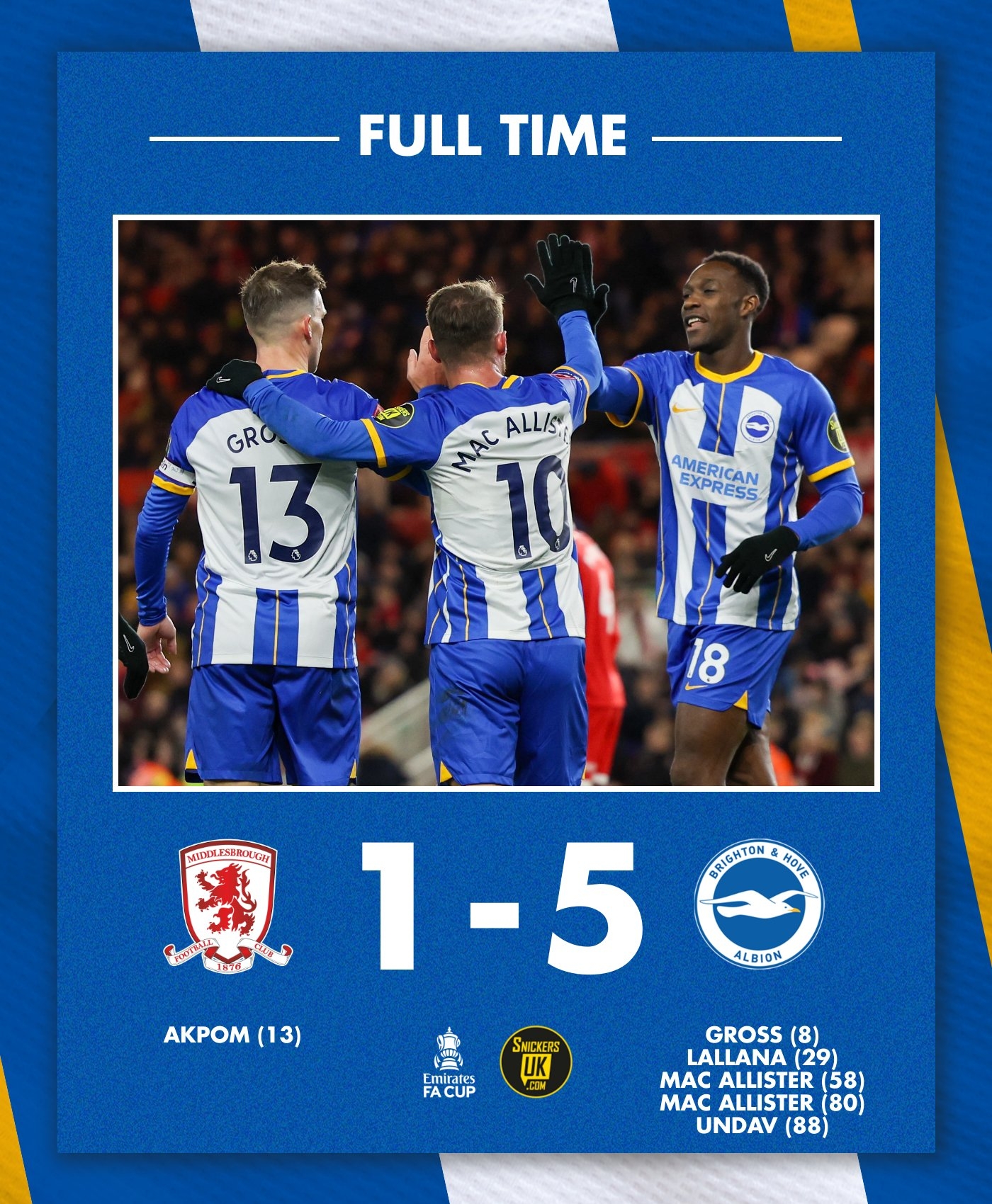 麦卡利斯特下半场替补登场,他第58分钟脚后跟破门,第80分钟推射梅开二度,安达夫88分钟锦上添花,布莱顿最终5-1击败米堡晋级第四轮。