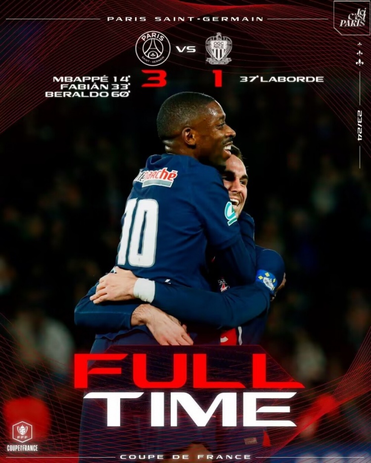 3月14日讯 北京时间3月14日凌晨4时10分,法国杯四分之一决赛,巴黎主场迎战尼斯。上半场,法比安助攻姆巴佩首开纪录,随后法比安破门,拉波德扳回一城。巴黎半场2-1领先尼斯。下半场,贝拉尔多打进一球。最终巴黎3-1击败尼斯,晋级法国杯半决赛,将对阵雷恩。巴黎前两个赛季均止步法国杯16强,这是巴黎时隔两个赛季后再进半决赛。