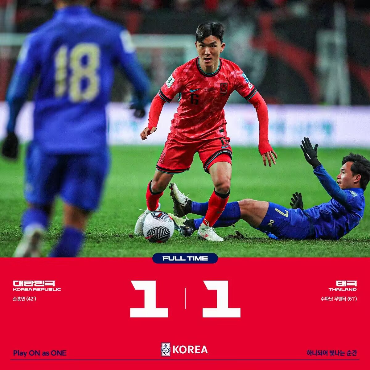 伤停补时6分钟。全场比赛结束,韩国1-1泰国。