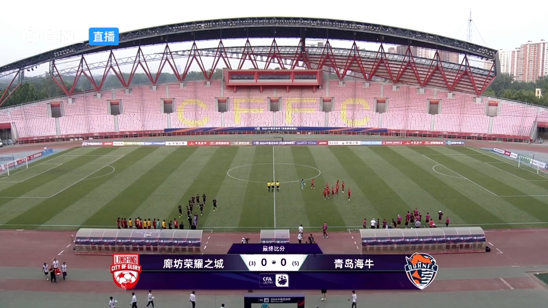 伤停补时5分钟。全场比赛结束,青岛海牛点球大战淘汰 廊坊荣耀之城,晋级16强。
