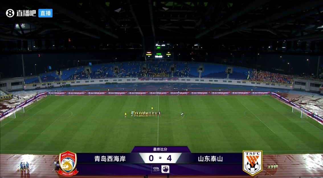 上半场补时1分钟,青岛西海岸0-1山东泰山。