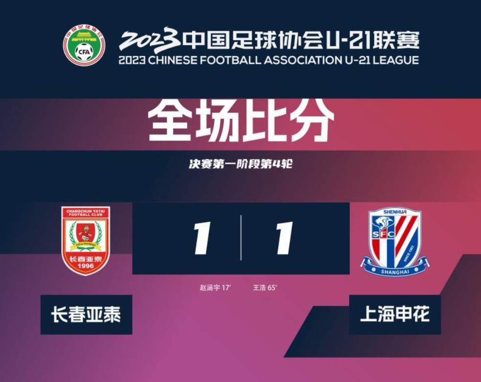 6月3日讯 U21联赛第4轮,长春亚泰U21与上海申花U21战成1-1,进球的球员分别是赵涵宇和王浩。