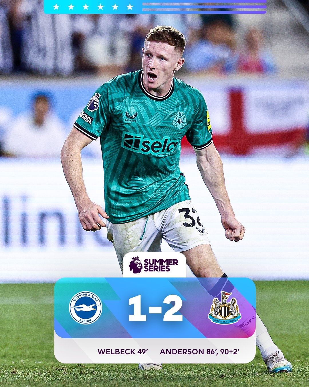 7月29日讯 友谊赛,纽卡斯尔对阵布莱顿。比赛第49分钟,三笘薰带球突破到底线传中,维尔贝克轻松推射空门为布莱顿先拔头筹。比赛第86分钟,安德森为纽卡扳平比分,比赛第92分钟,安德森单刀球破门完成绝杀。最终纽卡2-1战胜布莱顿。