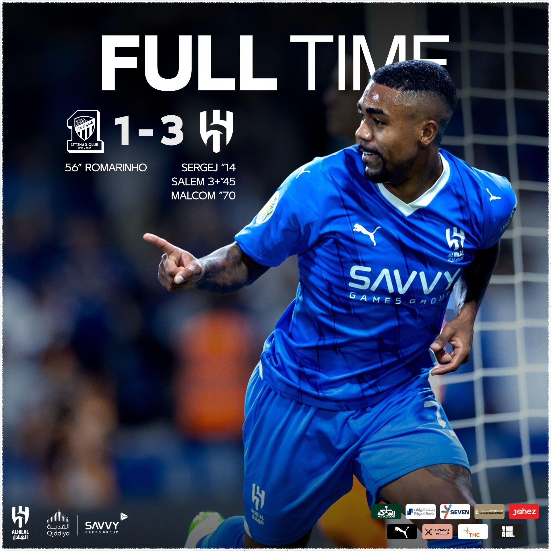 第70分钟,利雅得新月扩大比分!沙赫拉尼左路传到禁区后点马尔科姆甩头攻门打在立柱上弹进球门,吉达联合1-3利雅得新月。↓