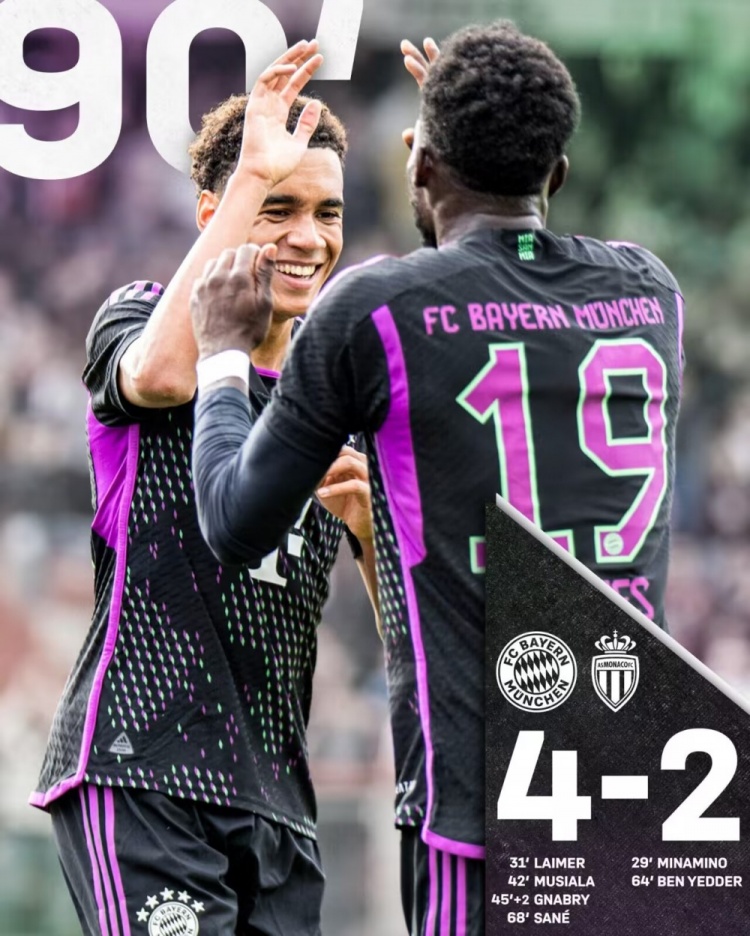 8月8日讯 北京时间8月7日晚23点整,2023年国际足球友谊赛展开角逐,拜仁慕尼黑对阵摩纳哥。上半场南野拓实首开纪录,莱默尔扳平比分,穆西亚拉1v3破门,格纳布里点射扩大比分,下半场特尔中柱,本-耶德尔点射扳回一城,萨内破门后中框。最终拜仁慕尼黑4-2战胜摩纳哥,拜仁友谊赛取得三连胜。