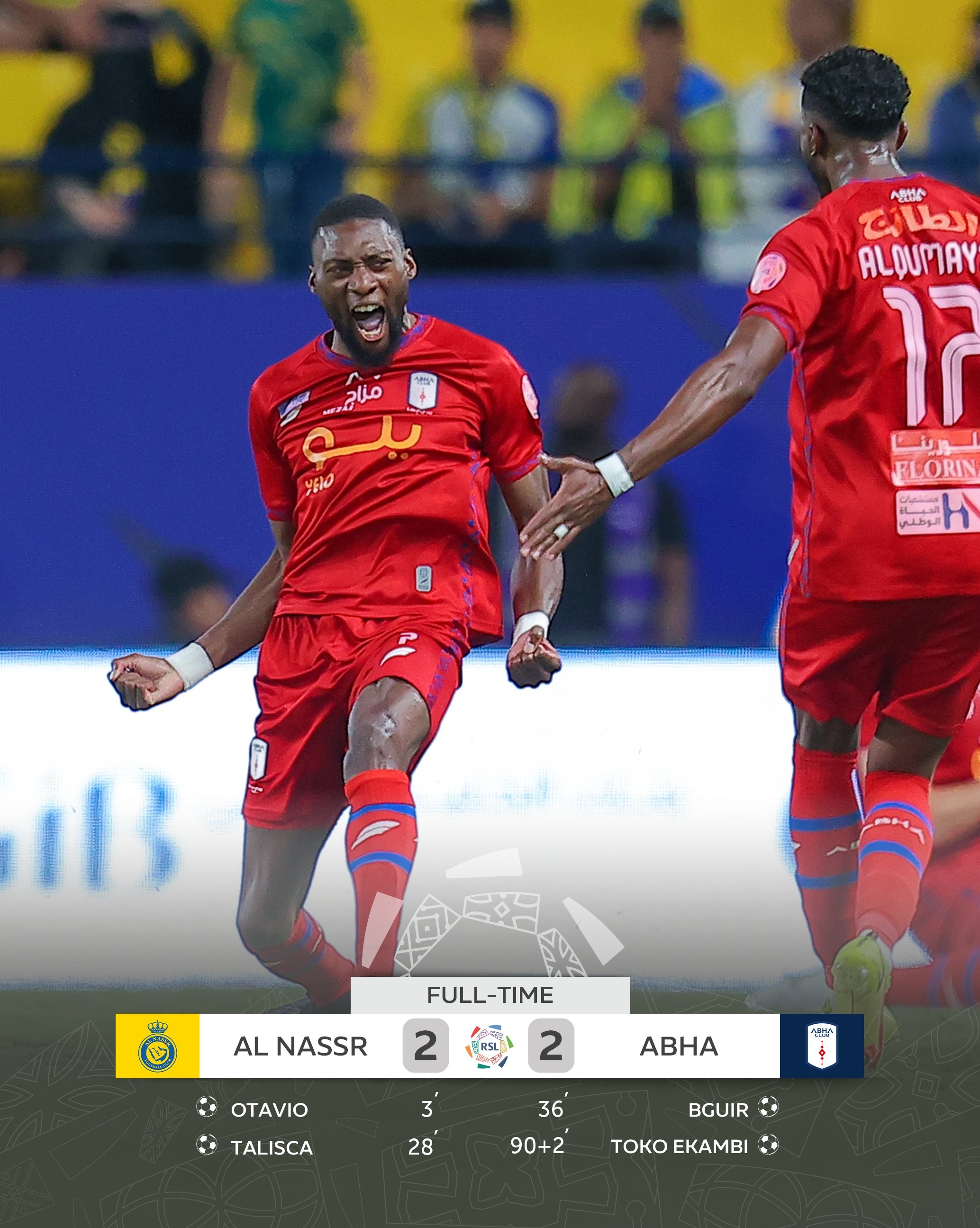 全场比赛结束,利雅得胜利2-2艾卜哈。