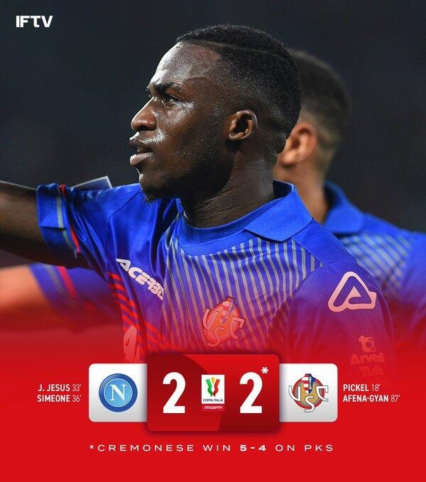1月18日讯北京时间1月18日凌晨4:00,意大利杯1/8决赛,那不勒斯对阵克雷莫纳。上半场,皮克尔破门为克雷莫纳取得领先,但随后胡安-热苏斯与小西蒙尼四分钟内连入两球将比分反超!下半场,扎尼马奇亚助攻吉安头球破门扳平比分!常规时间双方战成2-2!加时赛,塞尔尼科拉染红,双方均无建树!点球大战,洛博特卡失点,克雷莫纳五罚全中!全场比赛结束,那不勒斯6-7克雷莫纳无缘晋级!