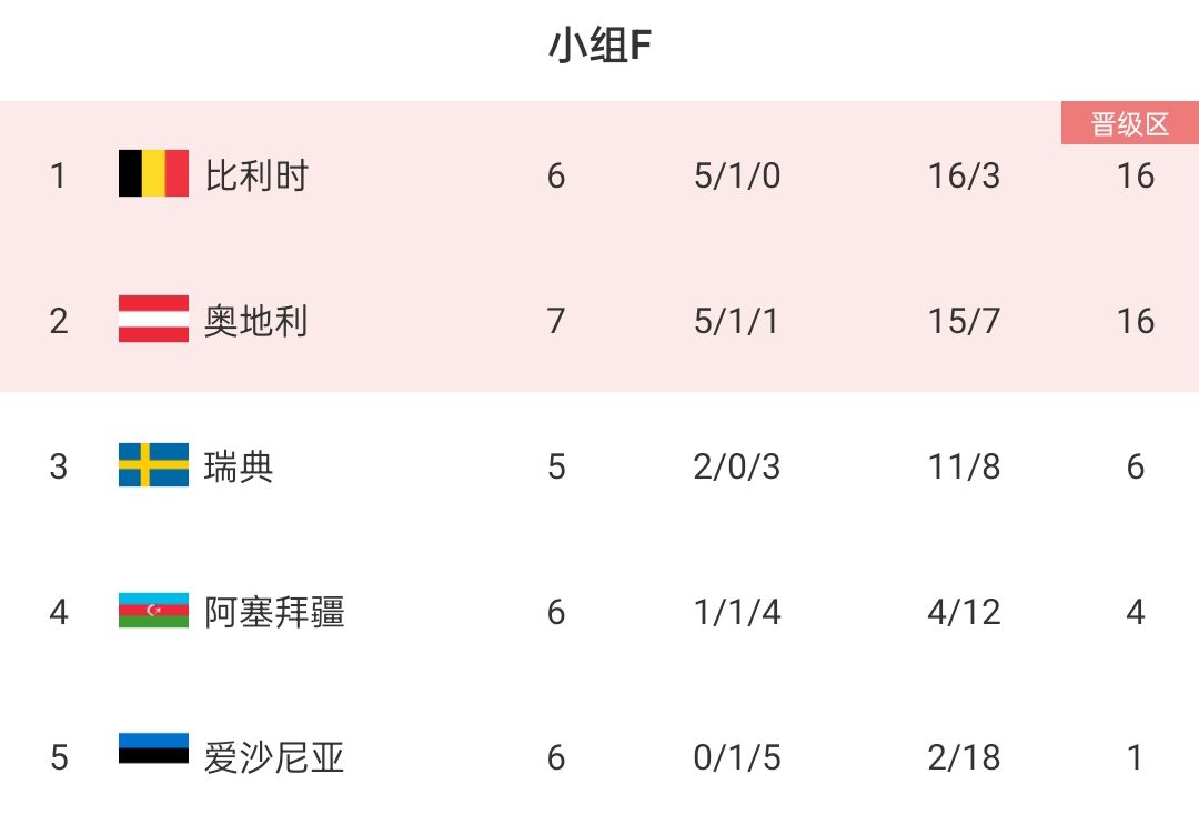 欧预赛F组,比利时6轮16分、奥地利7轮16分,两队都晋级欧洲杯正赛,接下来将竞争小组第一。