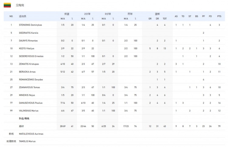 立陶宛:泽麦蒂斯10分2板3助、贝鲁卡11分5板、扎达纳维丘斯10分4板、瓦林斯卡斯12分2断、达纽塞维丘斯16分6板。