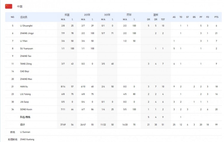 韩旭18分10板9助、张敬一21分2板、宋珂昕20分2板3助3断、刘禹彤16分4板、李双菲6分10板、李一凡7分、苏源圆2分5助、唐子婷9分7板4助、贾赛琪0分6板3助