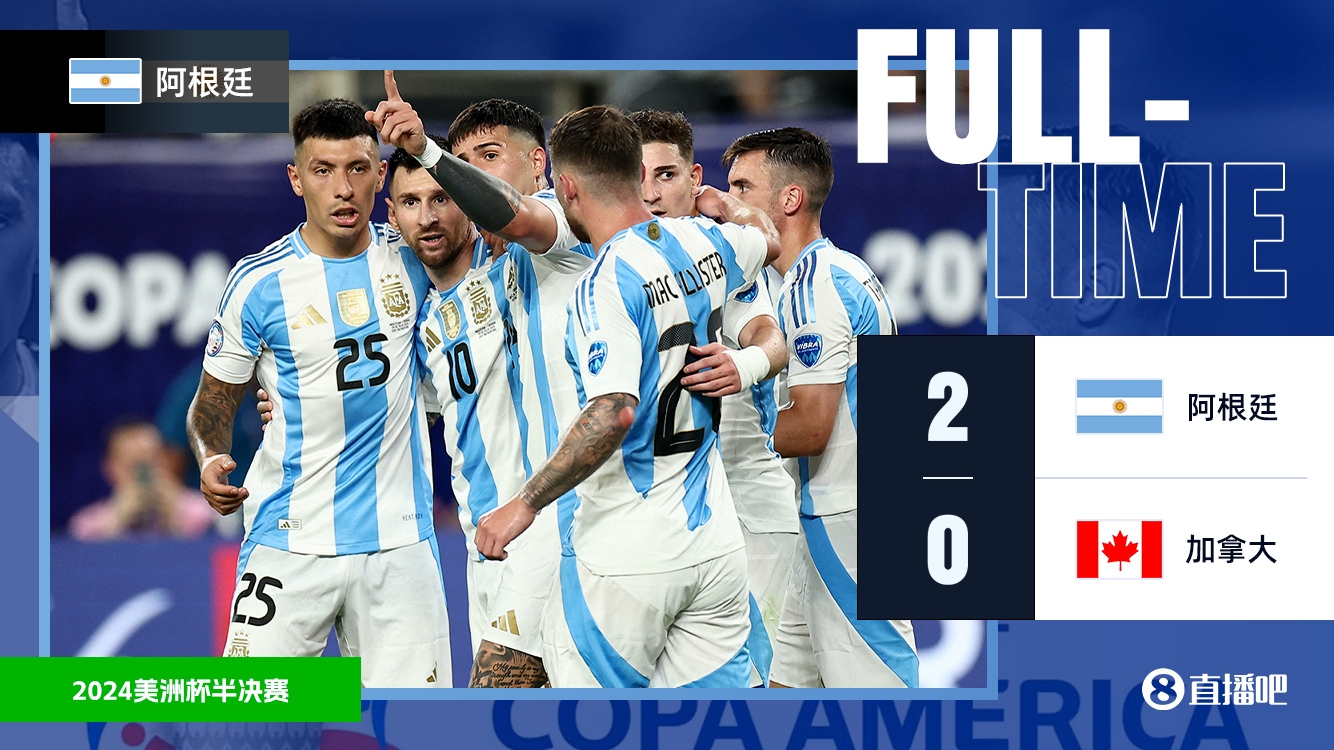 下半场伤停补时4分钟,全场比赛结束,最终阿根廷2-0加拿大。