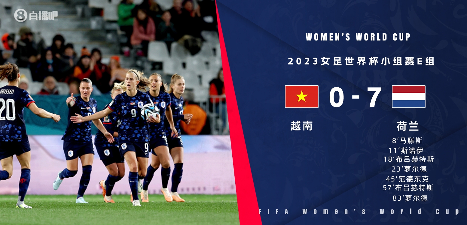 8月1日讯 北京时间8月1日15:00,女足世界杯小组赛E组第三轮的一场较量,越南女足对阵荷兰女足。上半场莉克-马腾斯、卡特娅-斯诺艾斯、埃斯梅-布吕赫特斯和吉尔-萝尔德接连破门,半场尾声阶段达妮埃尔-范德东克补射进球;下半场埃斯梅-布吕赫特斯轰出世界波,吉尔-萝尔德中框随后破门,最终荷兰女足7-0越南女足,小组头名出线。