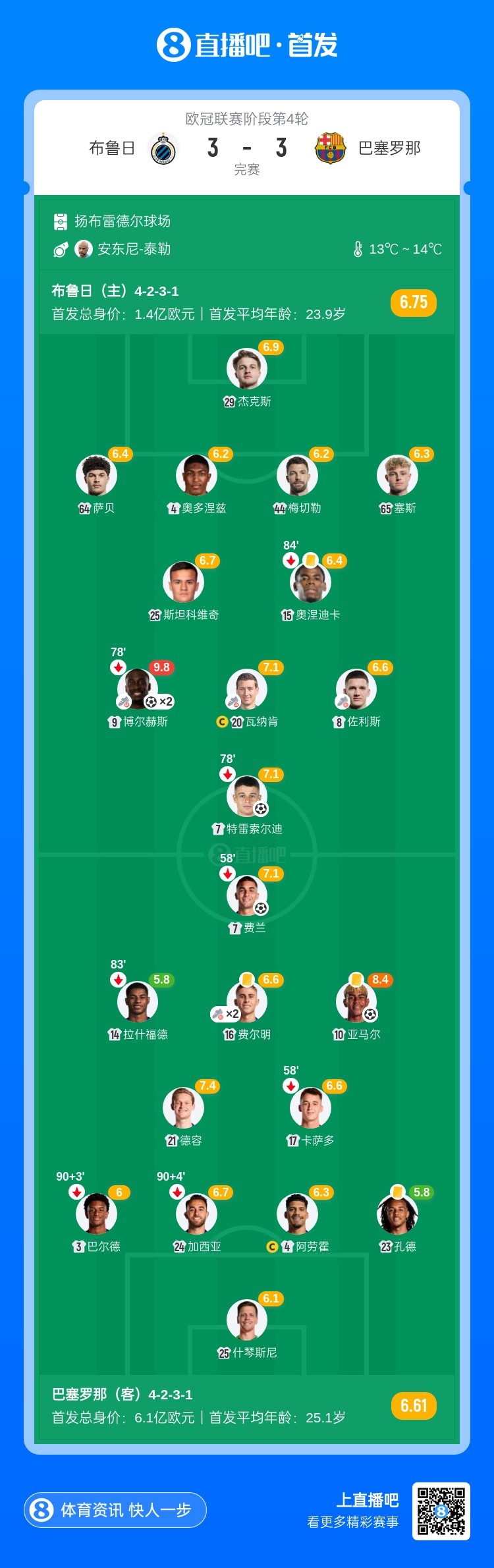 全场比赛结束,最终巴萨3-3布鲁日。