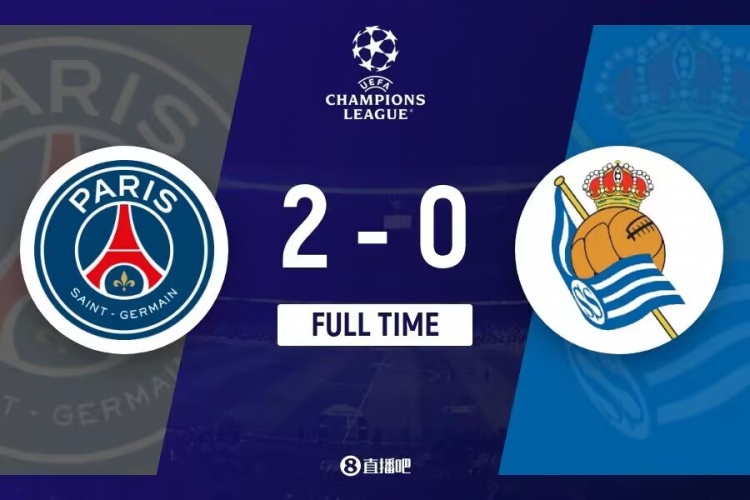 下半场伤停补时4分钟,全场比赛结束,最终巴黎圣日耳曼2-0皇家社会。