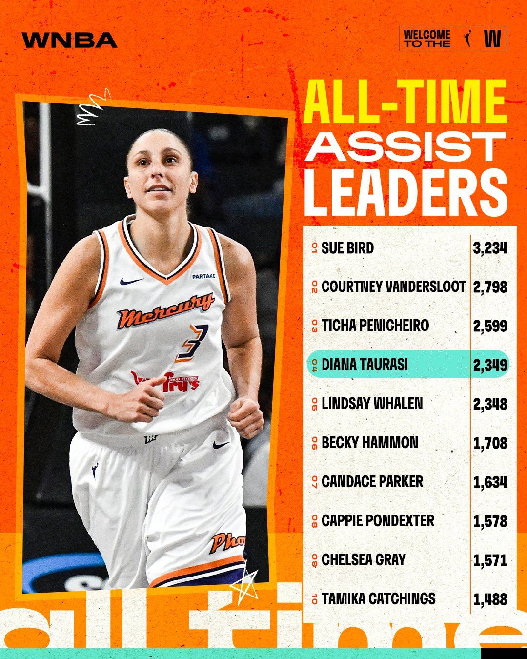 本场比赛42岁老将陶乐西达成里程碑,她的WNBA生涯总助攻数来到了2349次,超越了琳赛-惠伦排名历史第四。
