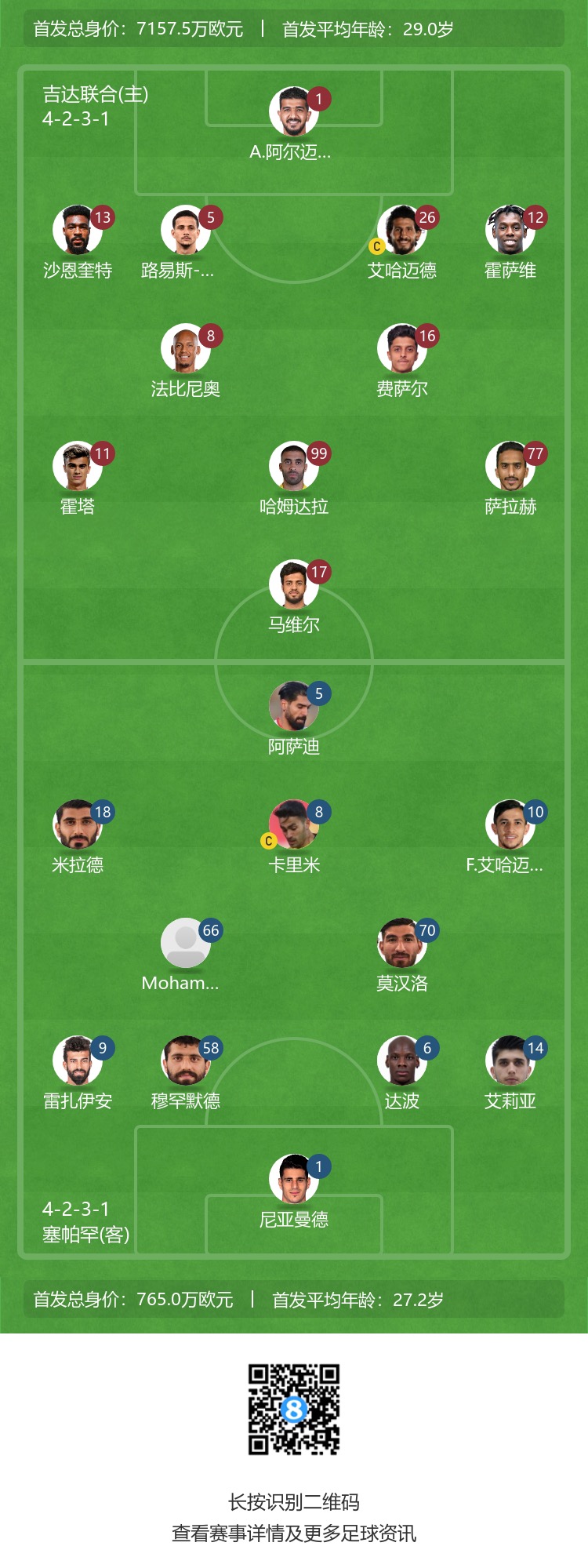 吉达联合首发:1-马约夫、5-路易斯-费利佩、26-赫加齐、12-扎卡里亚-豪萨维、13-山凯蒂、8-法比尼奥、16-加姆迪、77-阿姆里、17-萨哈菲、11-若塔、99-哈姆达拉