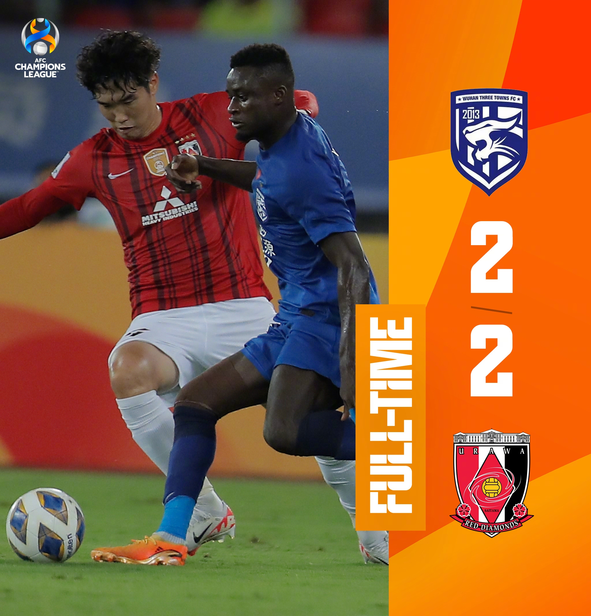 全场比赛结束,武汉三镇2-2浦和红钻。