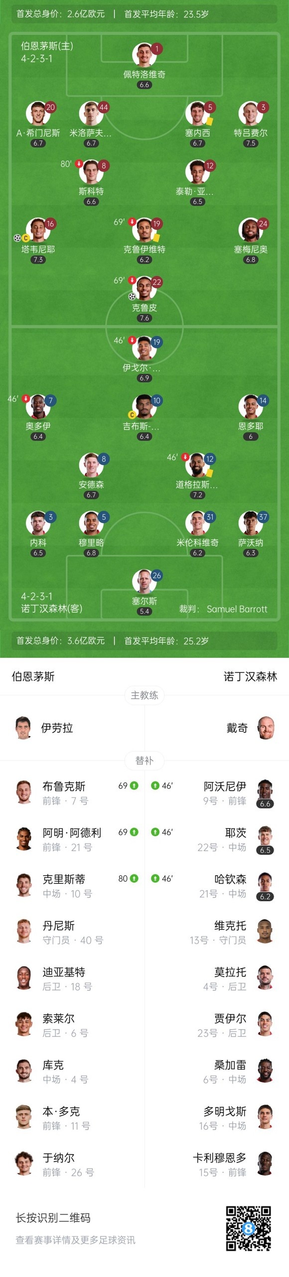 上半场补时2分钟,伯恩茅斯2-0森林。