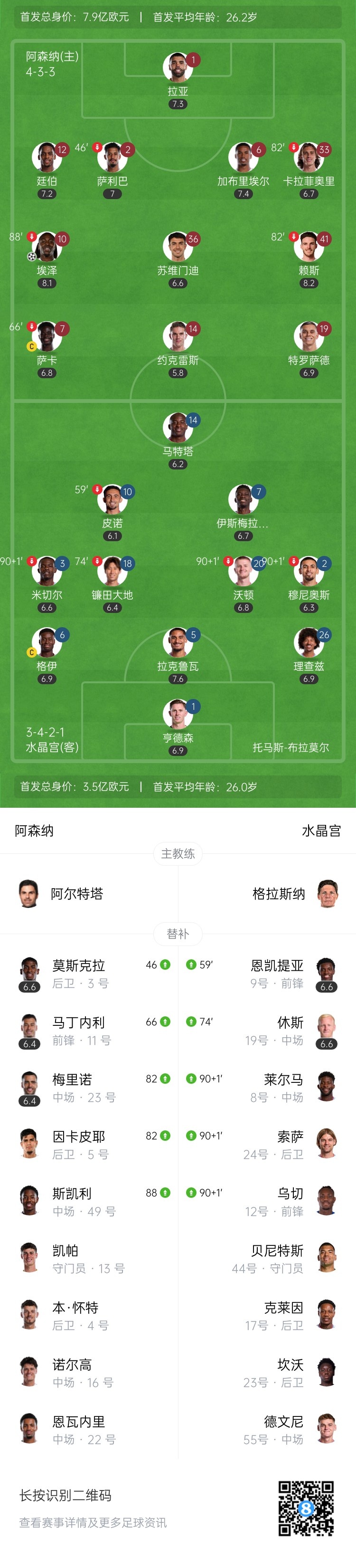 下半场伤停补时6分钟,全场比赛结束,阿森纳1-0水晶宫。