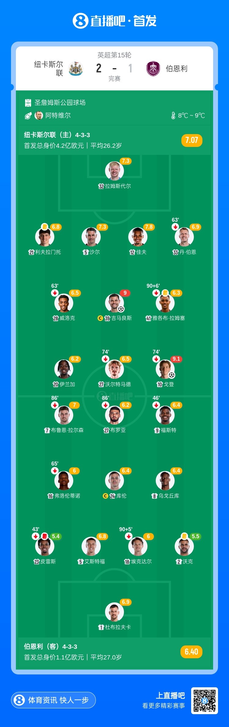 第11分钟,纽卡赢得左侧角球,吉马良斯主罚角球直接兜向球门后角!球直接进了!纽卡1-0领先伯恩利↓