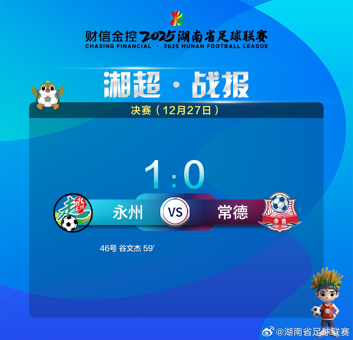 12月27日19:45,2025年湘超决赛在长沙贺龙体育场上演,由永州队对阵常德队。比赛第59分钟,永州队利用门前乱战机会由46号谷文杰打破僵局,最终永州队以1比0战胜常德队,夺得2025湘超冠军,常德队获得亚军。本场比赛共吸引43695人现场观赛。