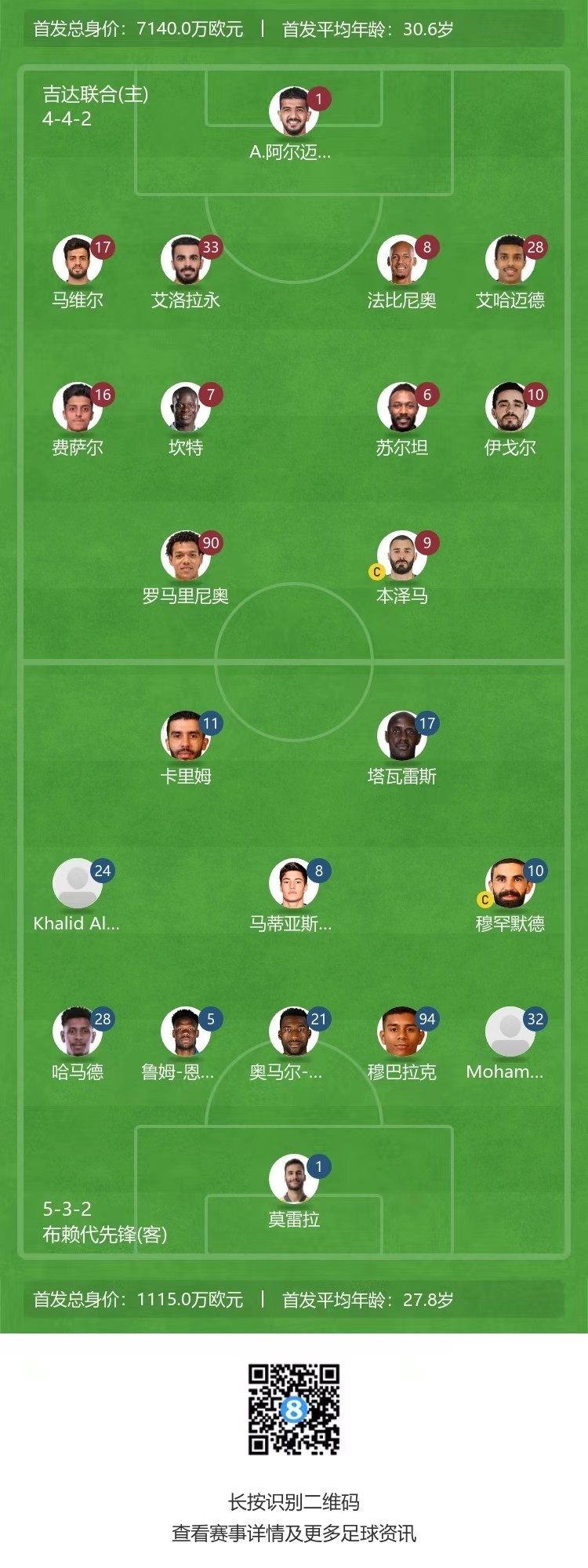 第22分钟,布赖代先锋左路发起传中,禁区中央的卡里姆无人盯防,轻松将球顶进,吉达联合0-1布赖代先锋↓